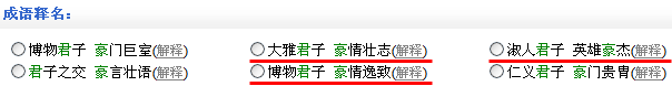 | 成語(yǔ)是自古至今形成的一些固定結(jié)構(gòu)和固定含義的詞組或短語(yǔ),絕大多數(shù)都是四字格。很多父母當(dāng)初在為孩子起名時(shí),可能是通過(guò)成語(yǔ)精選出來(lái)的。此外,平時(shí)我們?cè)诮榻B自己名字時(shí),總希望別人能體會(huì)到該名字蘊(yùn)涵的文化氣息和高雅內(nèi)涵,從而給人留下更深刻的印象。把自己的名字通過(guò)一個(gè)或兩個(gè)成語(yǔ)解釋出來(lái),就能達(dá)到這個(gè)效果。美名騰人名解析系統(tǒng)為您提供了強(qiáng)大的成語(yǔ)釋名功能,方便您為自己的名字選出最貼切的成語(yǔ)解釋。下圖顯示了“君豪”這個(gè)名字的成語(yǔ)釋名信息。
